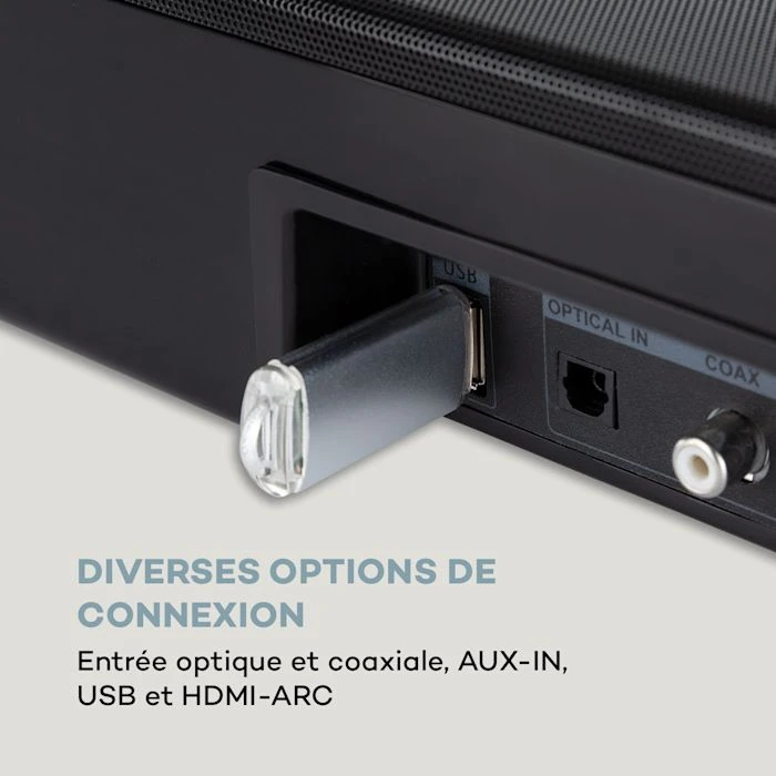 - Connexions : 1 x entrée optique, 1 x entrée coaxiale, 1 x entrée AUX (audio 3,5 mm), 1 x HDMI ARC, 1 x port USB