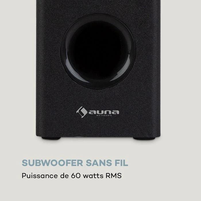 - Subwoofer sans fil : avec une puissance de 60 watts RMS