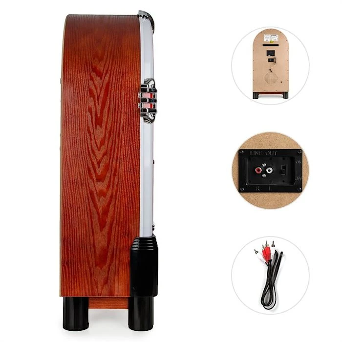 - Connectiques : 1 x port USB, 1 x slot carte SD, 1 x entrée jack AUX 3,5mm, 1 x sortie ligne stéré RCA