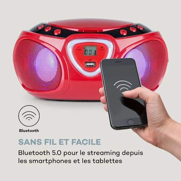 Flashdance ! Le CD Boomboxauna Roadie fait danser les couleurs et donne un bon coup de fouet à la cabane avec son lecteur CD, sa connectivité Bluetooth 5.0 et sa radio FM.