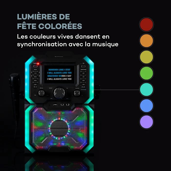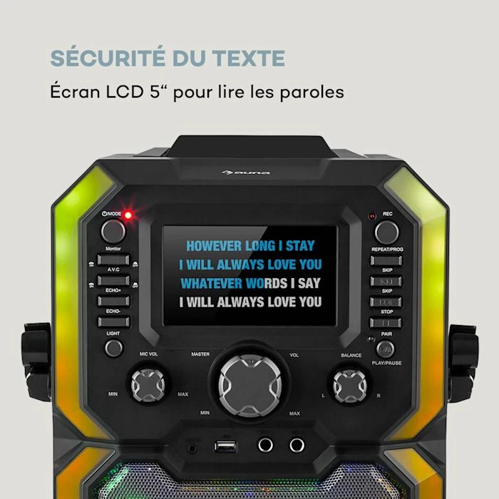- Paroles soulignées : écran LCD à cinq couleurs pour lire les paroles