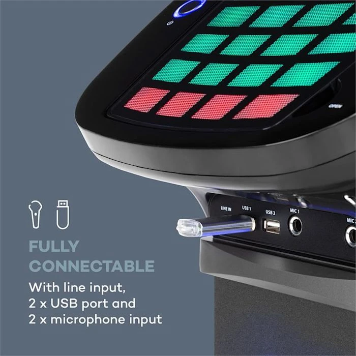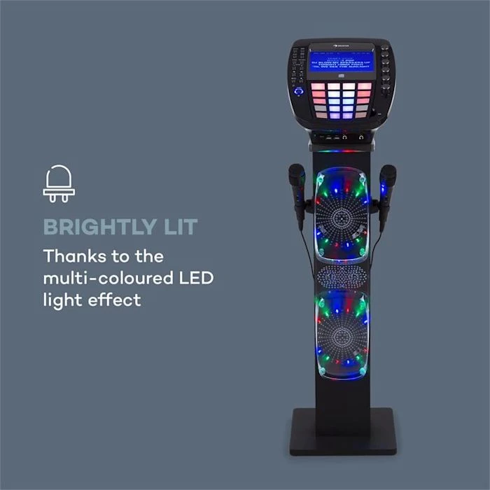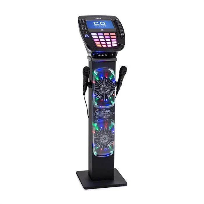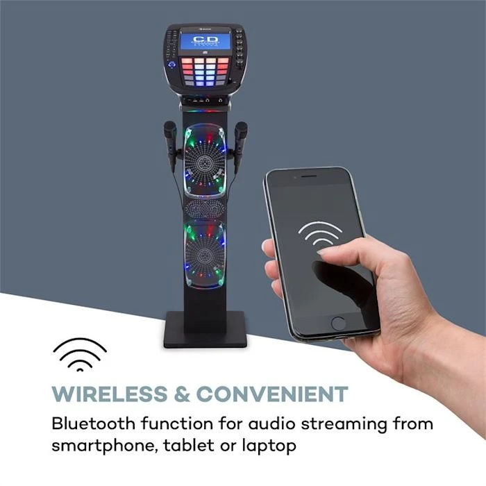 - Ensemble karaoké élégant avec écran couleur TFT 7″ (16:9), Connexion Bluetooth haut-parleur intégré à large bande