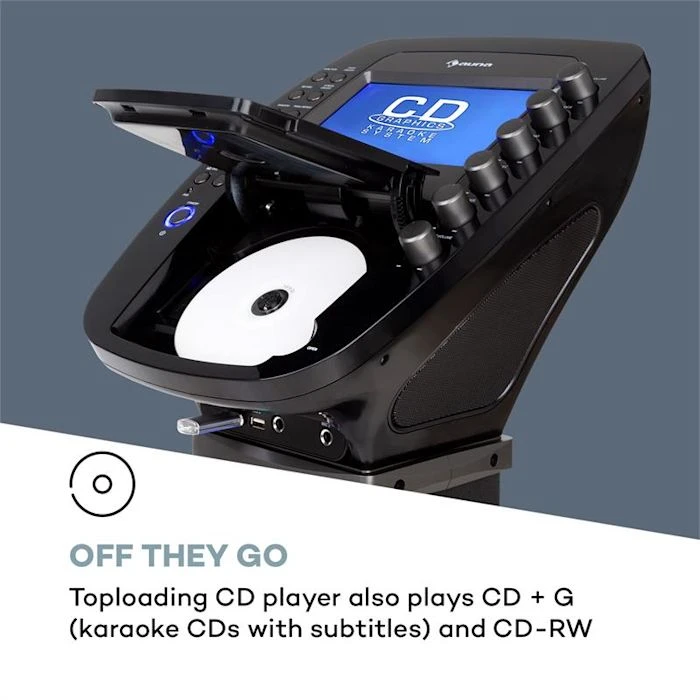 - Lecteur CD à chargement par le haut, compatible avec de nombreux formats – joue les CD+G (CDs karaoké avec sous-titres), CD-RW etc.