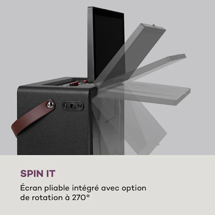 Le système karaoké auna Pro Spin 8 est l’appareil idéal pour tous les amateurs de karaoké grâce à sa sangle de transport, son grand écran tactile, ses 2 micros UHF sans fil et sa batterie performante.