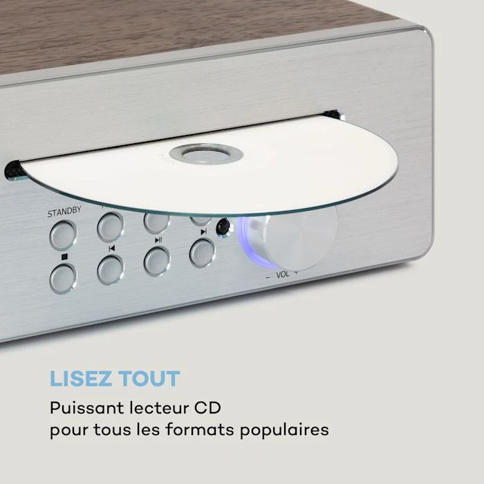- Elégant et connecté : boîtier imitation bois et port USB pour la lecture des MP3