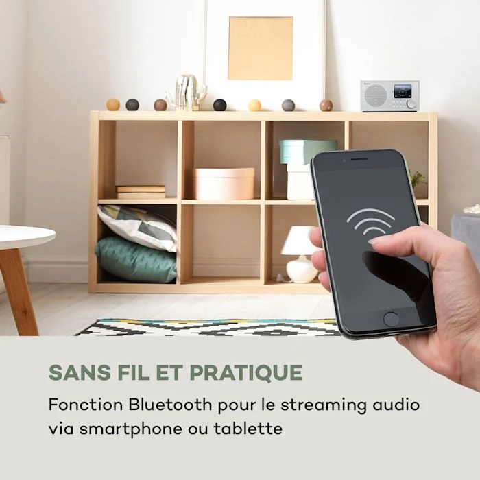 Il est temps de passer au plaisir de la musique de haute qualité ! Avec la mini radio Internet DAB +/FM auna Silver Star, vous pouvez offrir un appareil musical polyvalent à votre foyer, qui combine des performances puissantes, des fonctionnalités multiples et un design élégant en un seul appareil. Avec une puissance de sortie de 8 watts RMS, la radio tout-en-un offre la meilleure qualité sonore en tant qu’élément stationnaire dans la cuisine, la salle de bain ou le salon. La fonction Bluetooth intégrée est idéale pour les connexions sans fil, permettant de lire rapidement et facilement le contenu multimédia des périphériques externes. L’interface WiFi de la radio permet de recevoir jusqu’à 10 000 stations de radio Internet et d’utiliser l’appareil en tant que lecteur réseau. La radio est couplée sur le réseau avec d’autres appareils via l’application Air Music Control et permet la diffusion de musique avec le protocole UPnP/DLNA. Avec le tuner DAB+, vous pouvez recevoir en qualité numérique toutes les stations de radio en plus du tuner FM analogique, et profiter ainsi de la meilleure qualité sonore avec un son stable et sans parasite. Les services texte et image supplémentaires de DAB+ sont particulièrement mis en valeur par le large écran : les guides de programmes, les informations, les nouvelles, les morceaux de musique sont facilement lus sur un écran de 2,8″ (7 cm) HCC (contraste élevé et couleur). Ceux qui voudraient aussi utiliser d’autres sources de musique disposent de l’entrée ligne et d’un port USB à l’arrière qui ouvrent le système audio à d’autres sources sur smartphone, ordinateur portable, lecteur USB et lecteur MP3. La radio Intenet se controle par son panneau de commande à l’avant ou confortablement via la télécommande ou l’appli Air Music Control. La fonction d’alarme avec double alarme programmable et le mode snooze se révèlent également utiles. Au-delà des détails techniques, la radio séduit aussi avec son cadre en bois blanc qui donne son élégance particulière à cet appareil polyvalent avec surface de contrôle en aluminium et augmente ainsi la valeur de l’appareil.