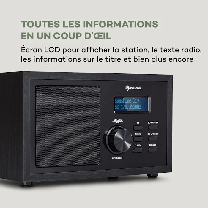 • Toutes les informations en un coup d’œil : écran LCD pour l’affichage de la station, du texte radio, des informations sur les titres et bien plus encore.