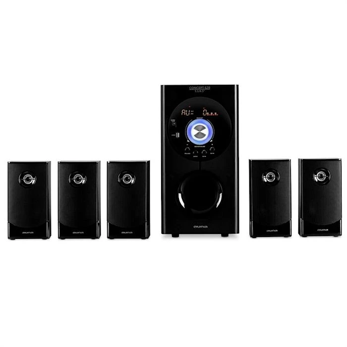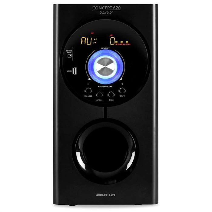 Le système d’enceintes actif Auna est un système home cinéma surround 5.1 multifonctionnel avec une radio FM/AM et unécran LED clair.
