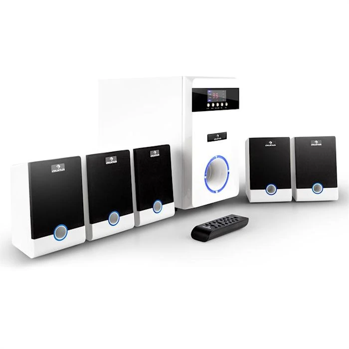 - Connexions: 1 x entrée stéréo RCA AUX, 1 x entrée 5.1 (RCA), 1 x série de sorties haut-parleur 5.1 (câble RCA dans les haut-parleurs satellites intégrés)