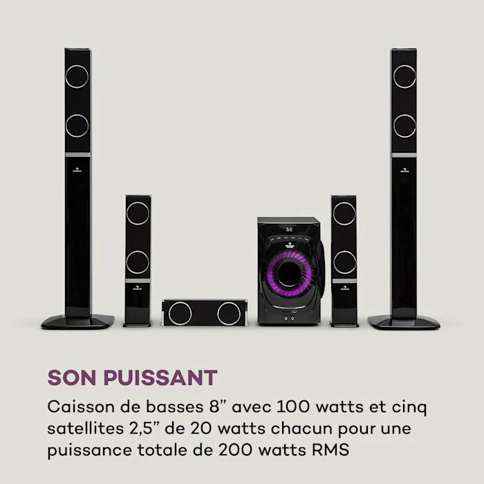 - Un son puissant : caisson de basses de 8″ avec 100 watts et cinq satellites de 2,5″ avec 20 watts chacun pour une puissance totale de 200 watts RMS