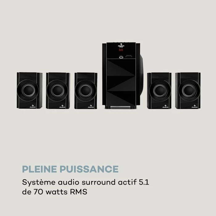 - Pleine puissance : système audio actif surround 5.1 de 70 watts RMS