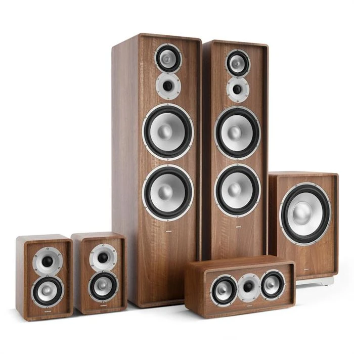 - Deux caissons de graves de 20 cm (8″) et un médium de 10 cm (4″) avec membrane en papier à faible résonance