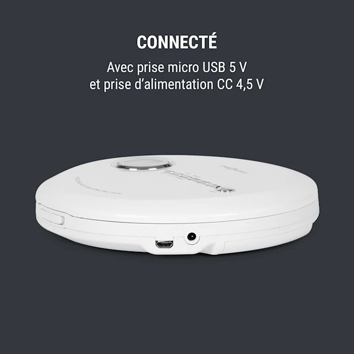 Le retour d’une légende : avec le discman oneConcept CDC 100MP3, le CD revient dans son usage portable, et ca avec la technique la plus moderne ! Il peut reconnaitre et lire les formats CD, CD-R, CD-RW et MP3-CD. Grâce à son fonctionnement sur piles, pas besoin de source d’énergie, et vous pourrez écouter jusqu’à 8 heures de musique où que vous soyez. A la maison, si vous le souhaitez, il fonctionne aussi sans problèmes à l’aide d’un bloc d’alimentation ou d’un câble micro-USB à brancher dans le port correspondant.