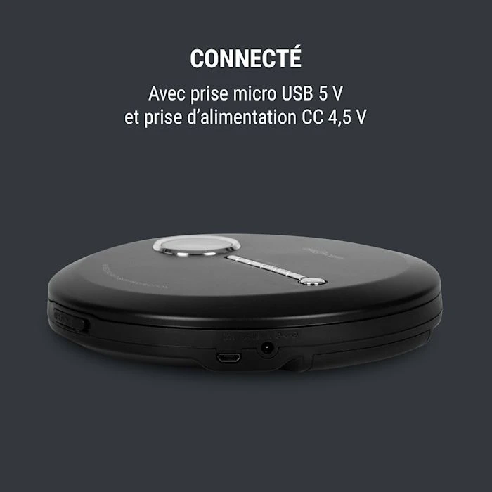 Le retour d’une légende : avec le discman oneConcept CDC 100MP3, le CD revient dans son usage portable, et cela avec la technique la plus moderne ! Il peut reconnaitre et lire les formats CD, CD-R, CD-RW et MP3-CD. Grâce à son fonctionnement sur piles, pas besoin de source d’énergie, et vous pourrez écouter jusqu’à 8 heures de musique où que vous soyez. A la maison, si vous le souhaitez, il fonctionne aussi sans problèmes à l’aide d’un bloc d’alimentation ou d’un câble micro-USB à brancher dans le port correspondant.