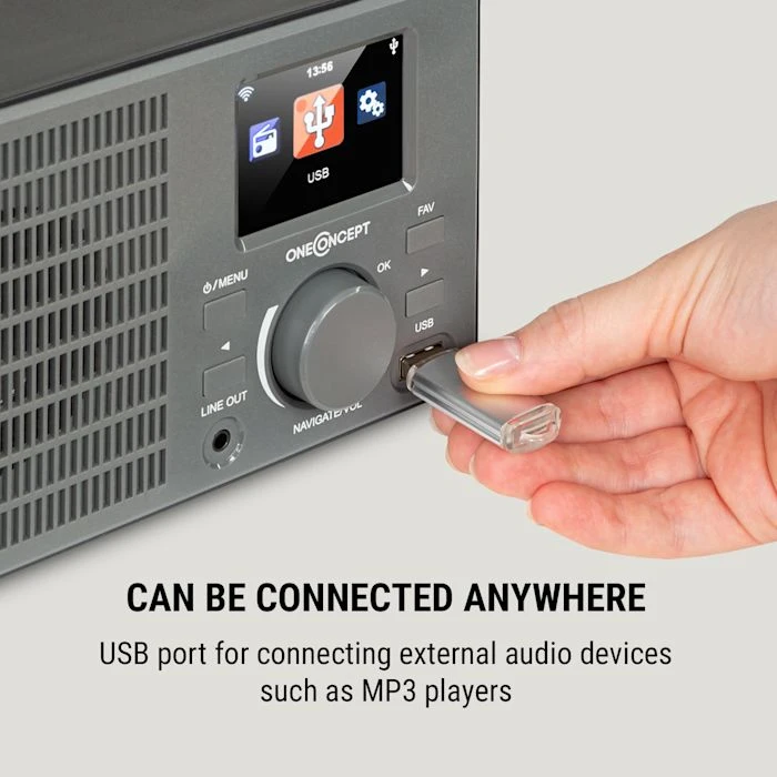 Découvrez tout l’univers de la musique dans un récepteur riche en fonctionnalités et au design rétro chic avec la radio Internet oneConcept TuneUp.